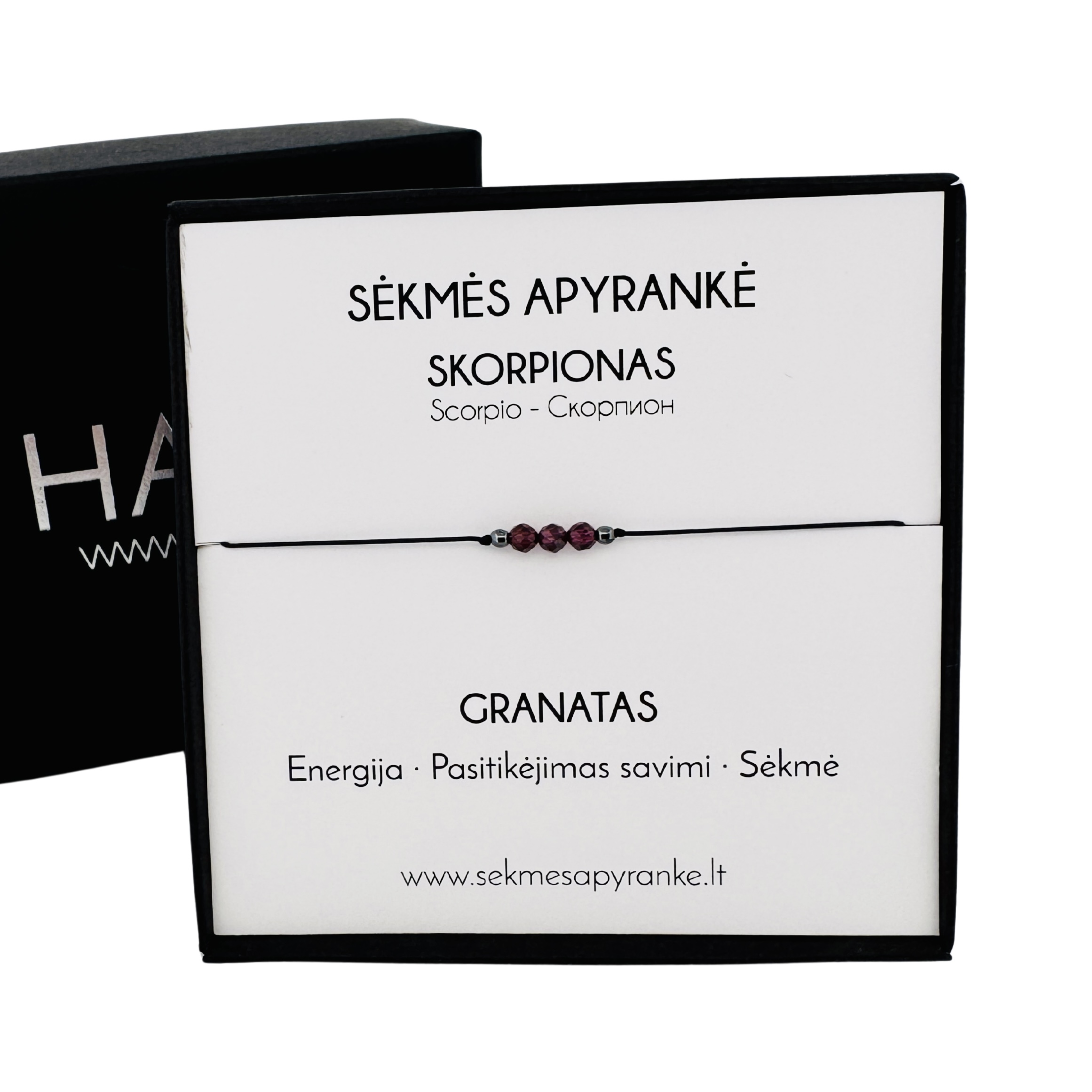 Sėkmės apyrankė SKORPIONUI • Granatas • Juodas siūlas